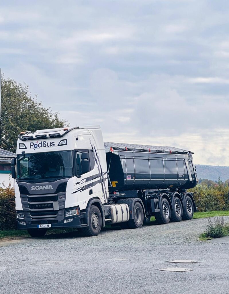 Scania 460 R hier im Einsatz mit einer Alu-Mulde beim Holzpellets- und Getreidetransport